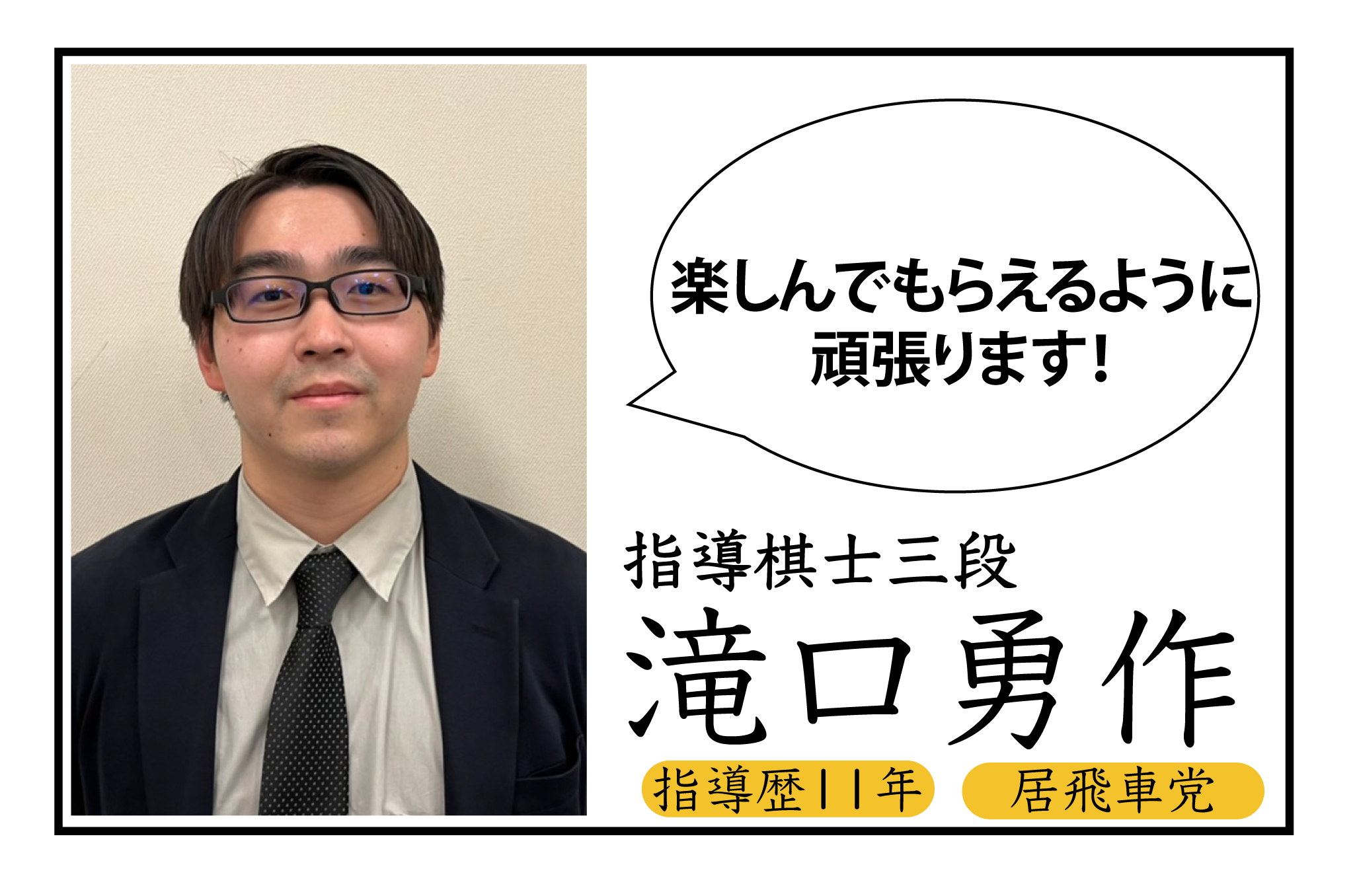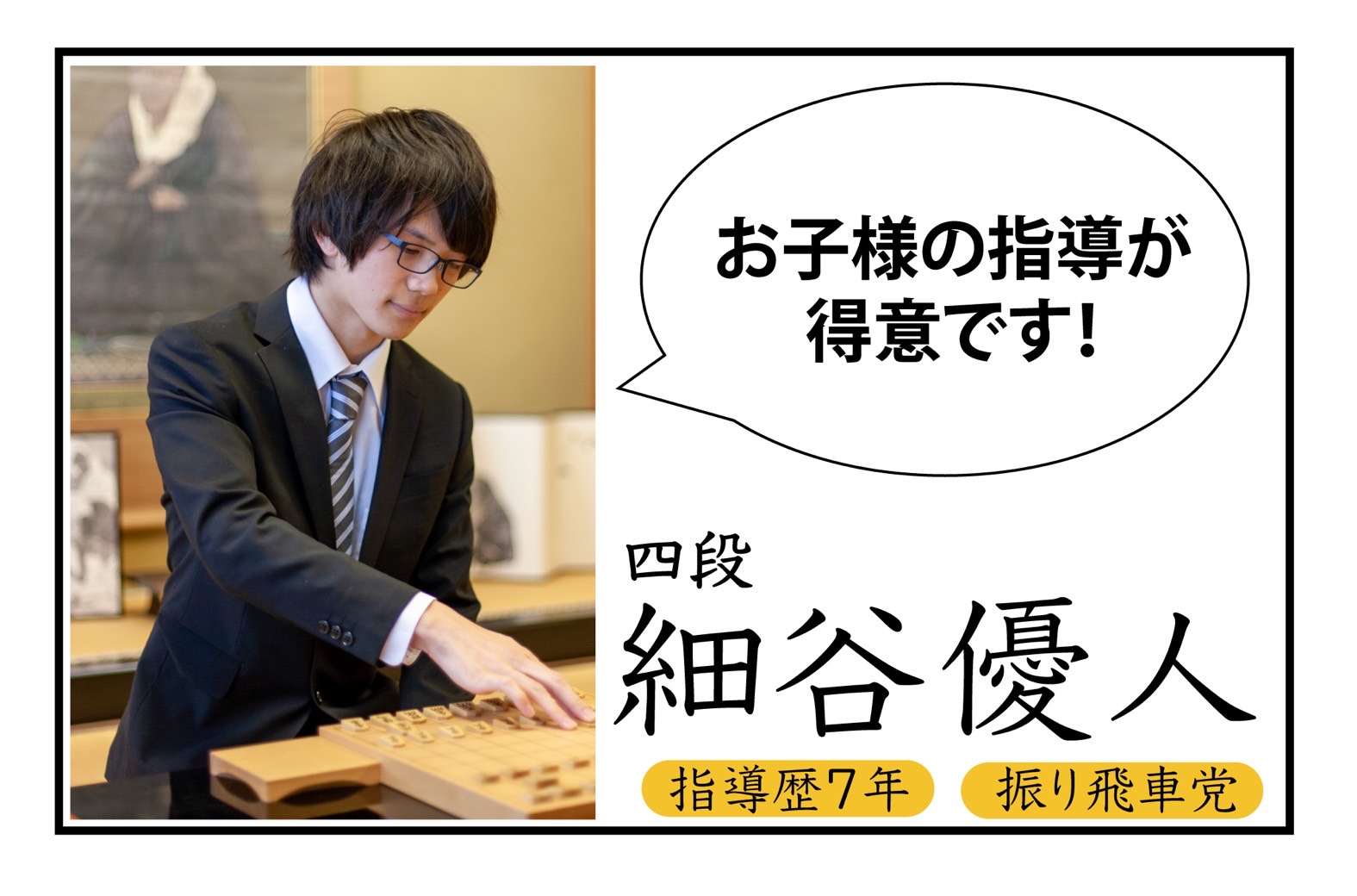 個人レッスンので一番大切なのは、講師の質の高さだと考えています。 「非常に高い棋力を持っている」「子どもを扱う仕事を経験している」このどちらかに特化した講師を積極的に採用しています。 初心者のうちから「一流の将棋」に触れることで、その後の伸びしろが最大化すると考えています。